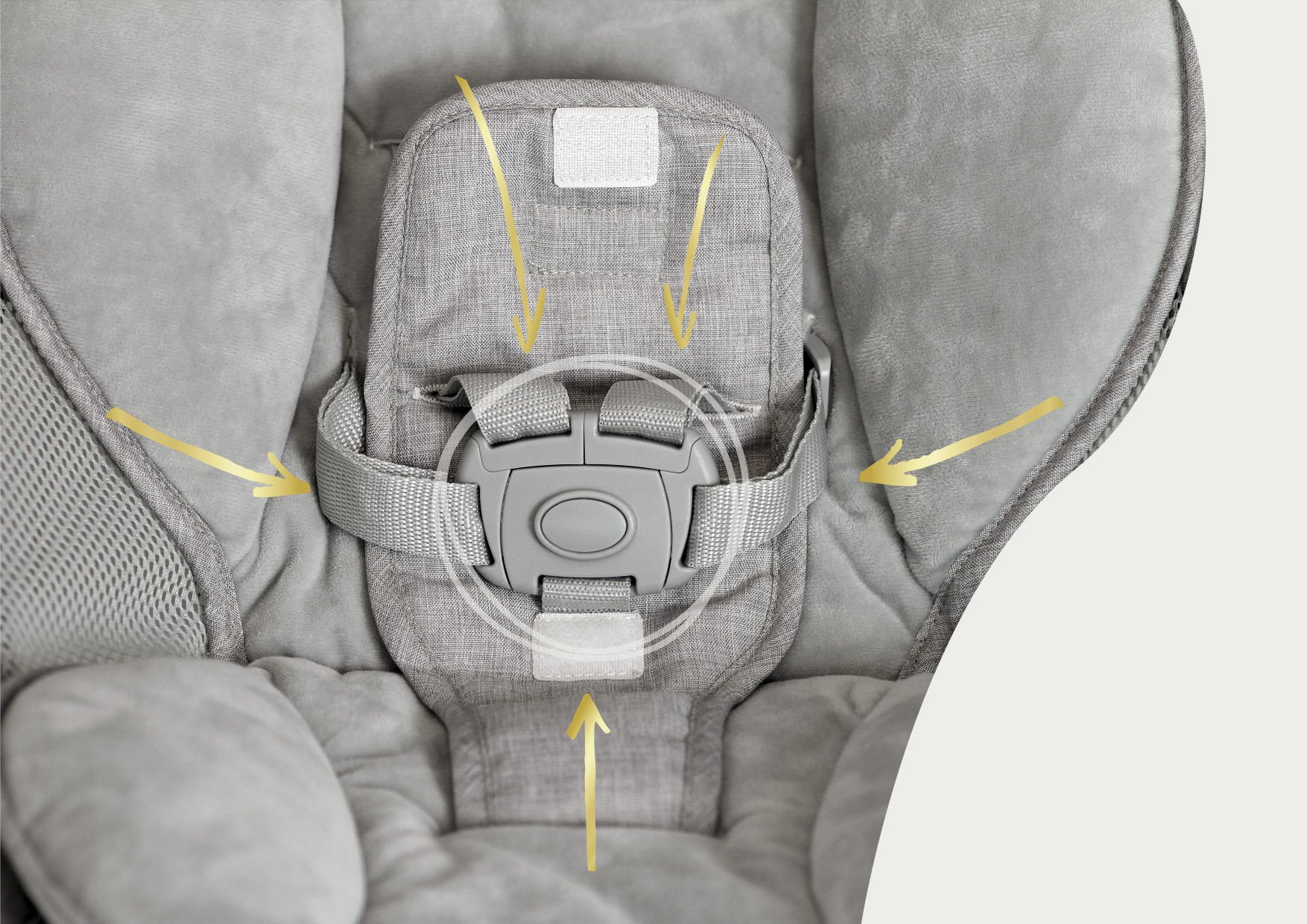 Bujaczek jest niezastąpionym strażnikiem bezpieczeństwa zarówno ruchliwego, jak i spokojnego malucha. 5 otulonych pokrowcem pasów stabilizuje pozycję, dzięki czemu nie musisz martwić się, że dziecko wypadnie z siedziska.