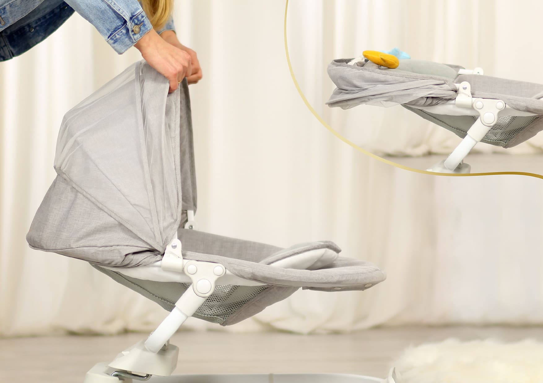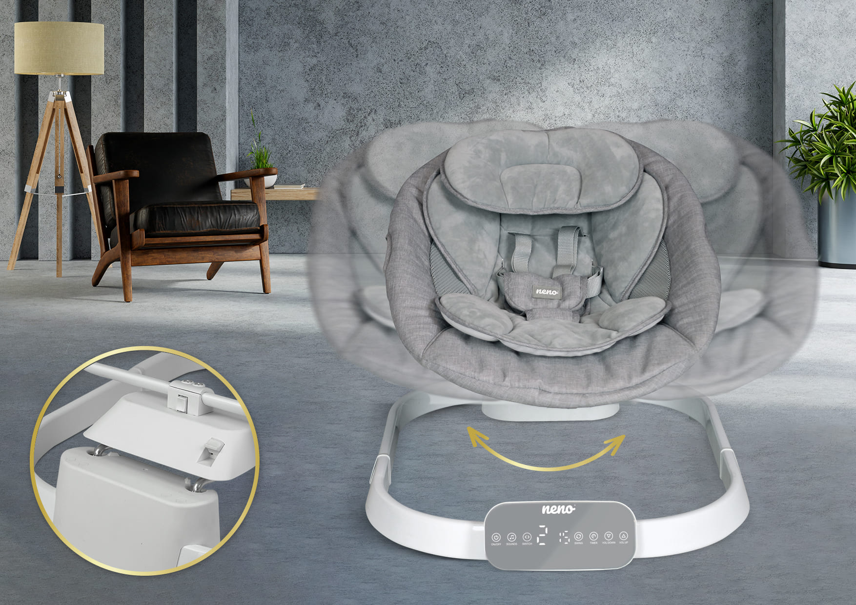 Produkt może posłużyć Wam nie tylko jako wspomagający usypianie bujak. Mechanizm blokady, który unieruchamia stelaż, zamienia Neno Nube w stabilny leżaczek, idealny do codziennego użytku i łatwy do przetransportowania.