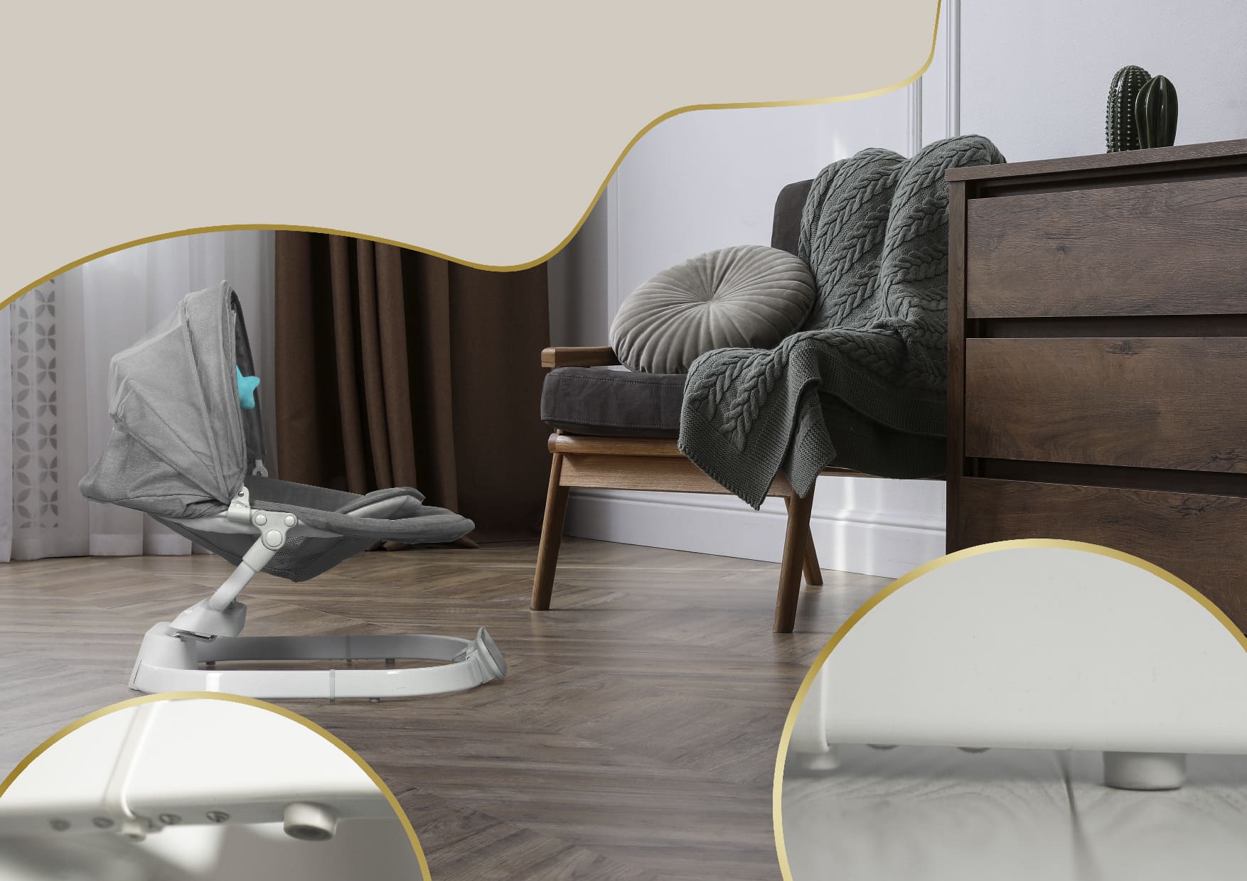 Gumowe stopki, przytwierdzone do podstawy bujaka, nie rysują podłogi, dzięki czemu nie musisz martwić się o powstanie zniszczeń na powierzchni parkietu.